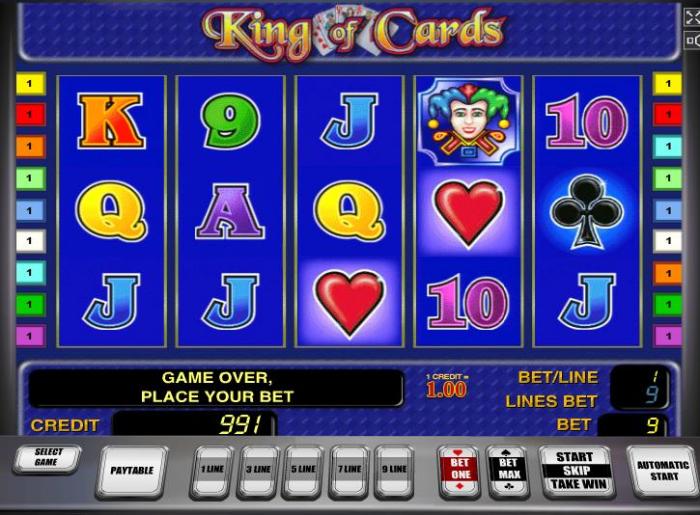 Видео-слот Kihg of Cards имеет несколько скромное музыкальное звучание, но приятное красочное дизайнерское воплощение. Рисунки символов проработаны до мелочей, вплоть до теней. Разработчики предоставляют много времени, в течение которого возможно предаваться игровому процессу бесплатно. Протестировать этот и другие игровые автоматы от компании Novomatic можно на сайте виртуального игрового клуба https://vabank.co/ . Интерфейс у слота Kihg of Cards классический, поэтому даже новичкам не составит труда разобраться в условиях навигации игрового автомата. Символы разделяются по уровню их доходности. Бонусные выплаты, прогрессивный джекпот не предусматриваются в данном слоте.