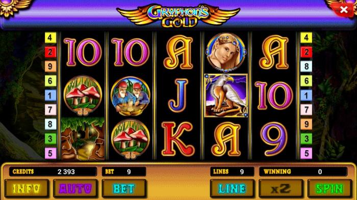 Пользователю открывается мистический мир, который населяют гномы, единороги при запуске видео-слота Gryphon’s Gold. В этом царстве сказочных обитателей всеми делами управляет прекрасная принцесса. По легенде в лесной чаще спрятан клад, который обычному смертному увидеть не надо. Только пройдя все испытания в данном слоте можно открыть вековую тайну. Структура игрового автомата – 5 барабанов и 9 игровых линий присутствует и игра на удвоение.