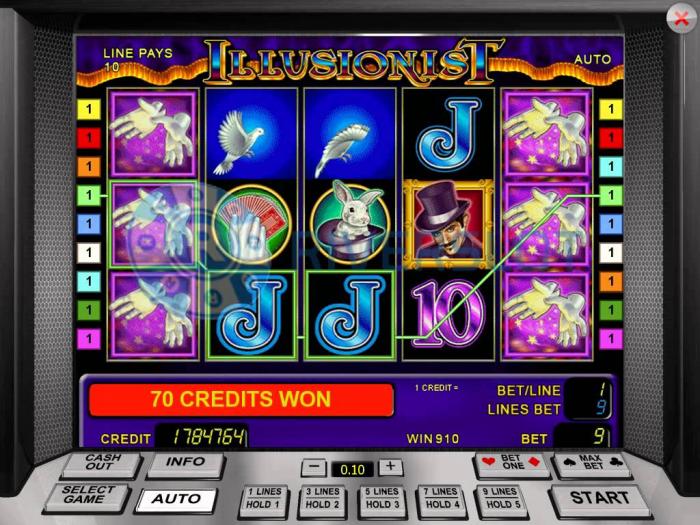 Автомат Illusionist выполнен в традиционной манере компании Novomatic, что касается звукового сопровождения, проработки символики (иллюзионист, руки, кролик, голубь). Графика и цветовое исполнение свидетельствуют о несомненном таланте создателей. Панель управления выполнена в классическом варианте. Можно предаваться игре бесплатно, выигрывая до 500000 ставок, а помогают в этом руки иллюзиониста. На протяжении всей игры не покидает ощущение, что вы попадаете в любимый цирк детства.