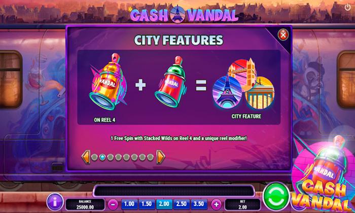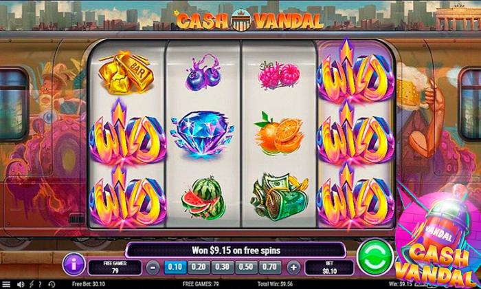 Кэш Вандал – это слот-машина с четырьмя барабанами и десятью активными линиями для выплат. Основная тематика игры максимально классическая – фруктовая. Однако выполнена ультрасовременно. К примеру, в качестве символов на барабанах дизайнеры использовали красочные граффити. А главная тема игрового автомата - городской арт.