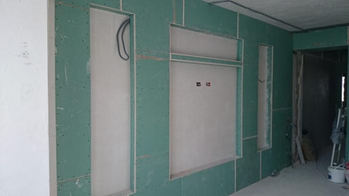 Наконец, помимо строительных растворов, для выравнивания также используют различные технические панели. Чаще всего выбирают гипсокартон, плиты OSB или МДФ. Лучше всего их устанавливать на предварительно собранный каркас из бруса или металлического профиля. Получаются так называемые фальшстены, обладающие абсолютно гладкой поверхностью.