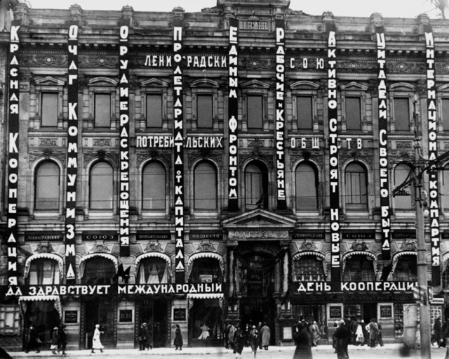 Праздничное оформление магазина «Пассаж», посвященное Международному дню кооперации. Июль. Неизвестный автор. Ленинград.