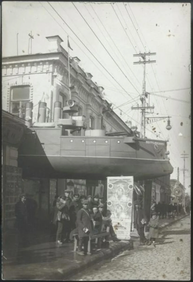 Оформление кинотеатра в связи с премьерой фильма «Броненосец "Потемкин"» в кинотеатре «Великан» в Краснодаре.
