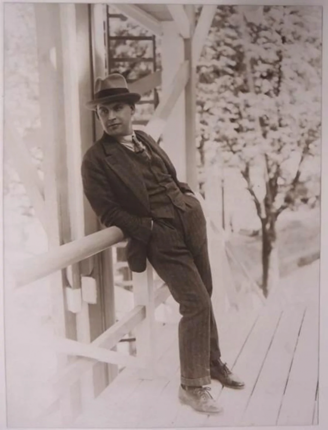 Александр Родченко у входа в павильон Константина Мельникова на выставке 1925 года в Париже. Март – октябрь. Автор: Анри Мануэль. Франция.