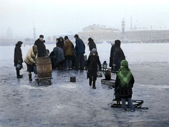 Жители Ленинграда набирают воду из проруби на Неве. Ленинград, 1942 год.