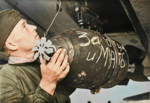 Советский оружейник загружает в бомбардировщик бомбу ФАБ-50 с надписью «За отца и мать». Украинская ССР, 1943 год.