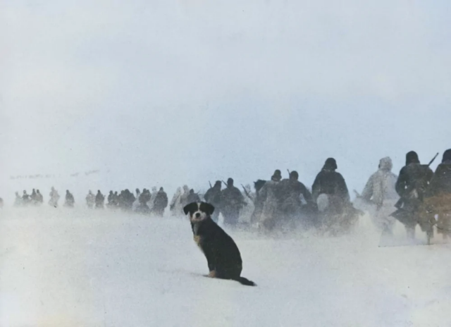Собака на фоне колонны итальянских солдат, отступающих из Сталинграда. Декабрь 1942 года.