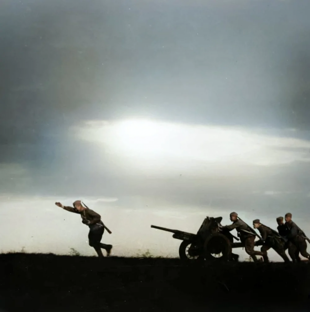 Расчет советской 45-мм противотанковой пушки меняет позицию, 1941-1945 год.