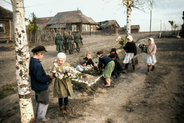 Дети возлагают цветы на могилу советских солдат. Ржев, 1943 год.