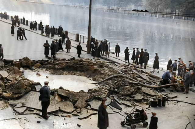 Воронка от авиабомбы на набережной Фонтанки. Ленинград, сентябрь 1941 года.