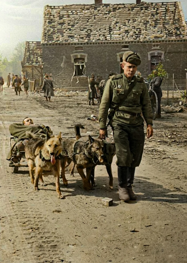 Собачья упряжка везет раненого советского бойца в госпиталь. 1-й Украинский фронт, 1944 год.