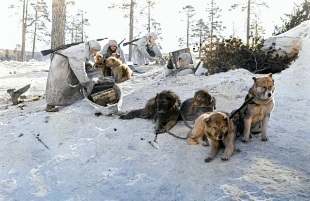 Красноармейцы доставляют на передовую боеприпасы на собачьих упряжках с лодками-волокушами. Карельский фронт. Мурманская область, 1943 год.