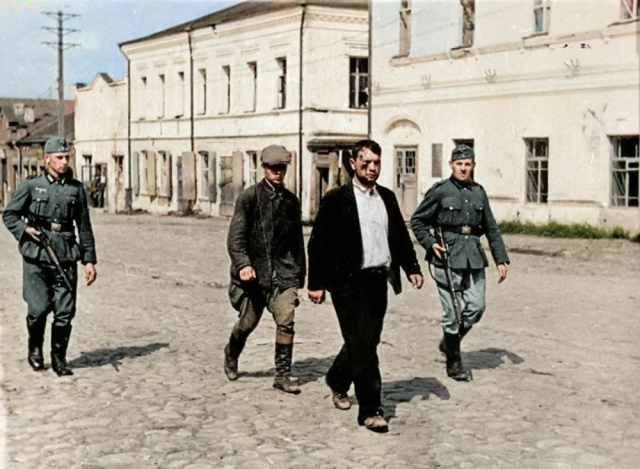 Немецкий патруль ведет пойманных переодетых советских солдат по улице города Велиж, 1941 год.