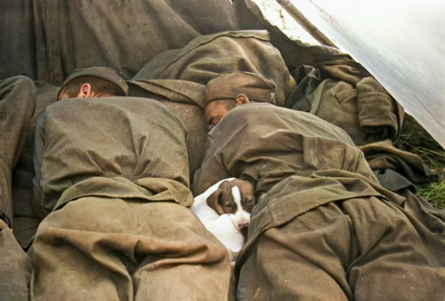 Спящие красноармейцы и собака. Чехословакия, 1945 год.