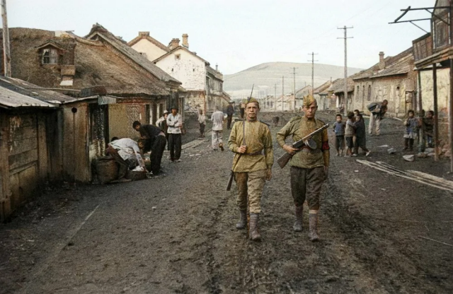 Советские бойцы патрулируют поселок в Маньчжурии, 1945 год.