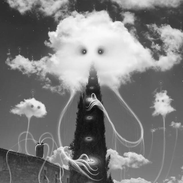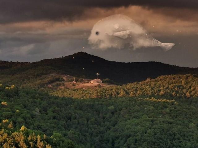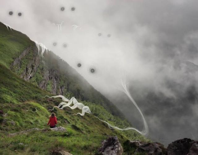 Одна из его самых захватывающих серий,— «Вмешательства»,— оживляет сельские пейзажи таким образом, что они кажутся одновременно тревожными и прекрасными.