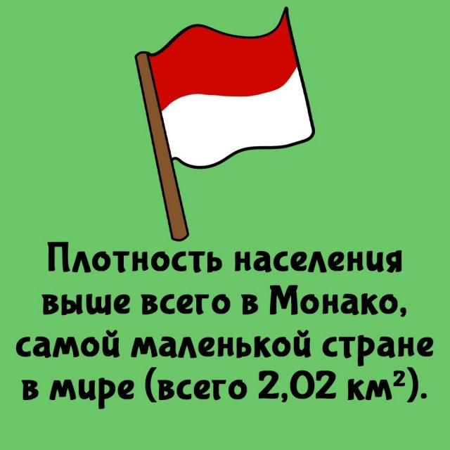 Самой маленькой стране в мире (всего 2,02 км?). Тут она достигает 18.600 чел/км?! В Сингапуре, который стоит на второй строчке этого рейтинга, плотность населения составляет около 7300 чел/км?.