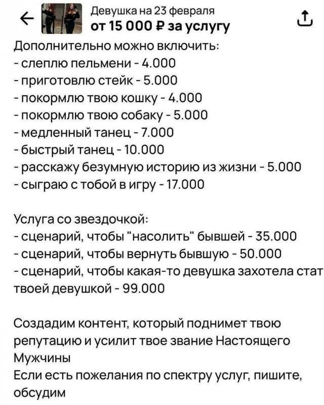 Ребята, приближается 23 февраля - или мужской праздник. Конечно, приятнее отмечать его вместе с любимой, но что делать, если ее нет? Есть оригинальный способ. Но за него нужно заплатить.