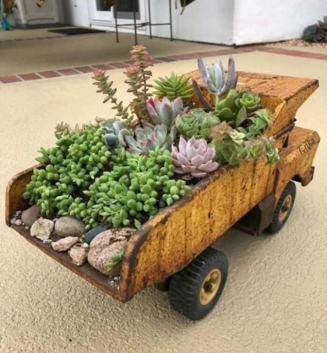 Старая игрушечная машина превратилась в цветочную мини-клумбу