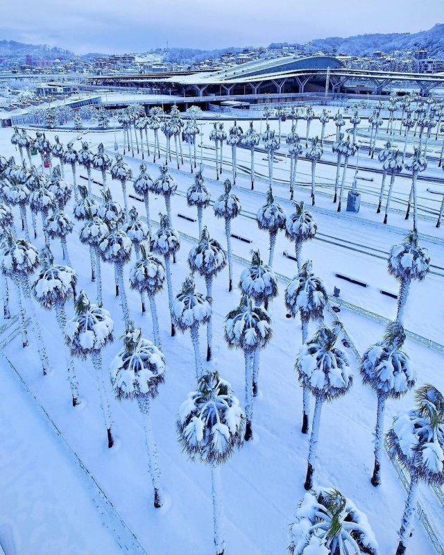 Сегодня последний день зимы. Завтра наступает долгожданная весна! А тем временем Сочи завалило снегом! Впервые за 10 лет столицу курортов занесло сугробами под 30 см. Электромобили массово отключаются, канатную дорогу в Дендрарии закрыли, а на пляже местные вовсю лепят снеговиков.
