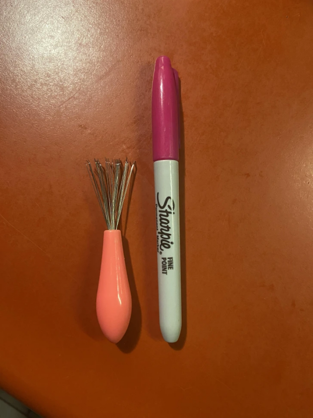 "Пластиковая ручка, а на конце веер из металлических зубцов"