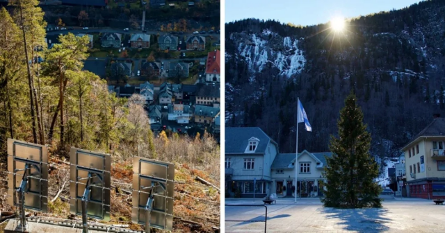 Норвежский город Рьюкан и его огромные зеркала. Город окружён горами, поэтому здесь используются три гигантских зеркала для отражения солнечного света в течение шести тёмных месяцев года.