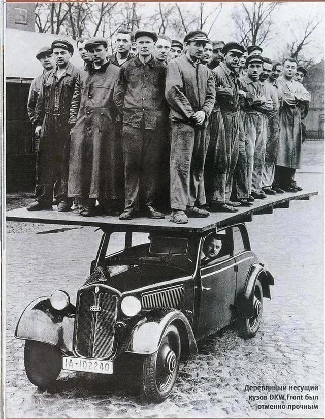 28 человек стоят на автомобиле марки DKW F8, чтобы проверить прочность деревянного кузова, 1932 год