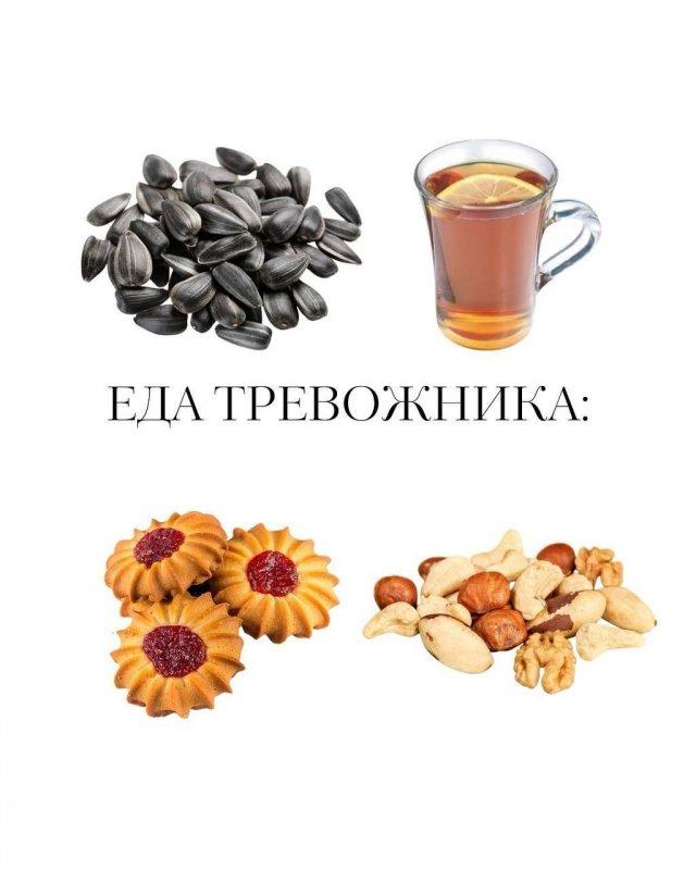 • Тревожный — печеньки, орешки, семечки;