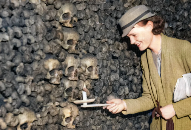 Посетительница катакомб Парижа со свечой в руке улыбается, глядя на большую коллекцию черепов, 1934 год.