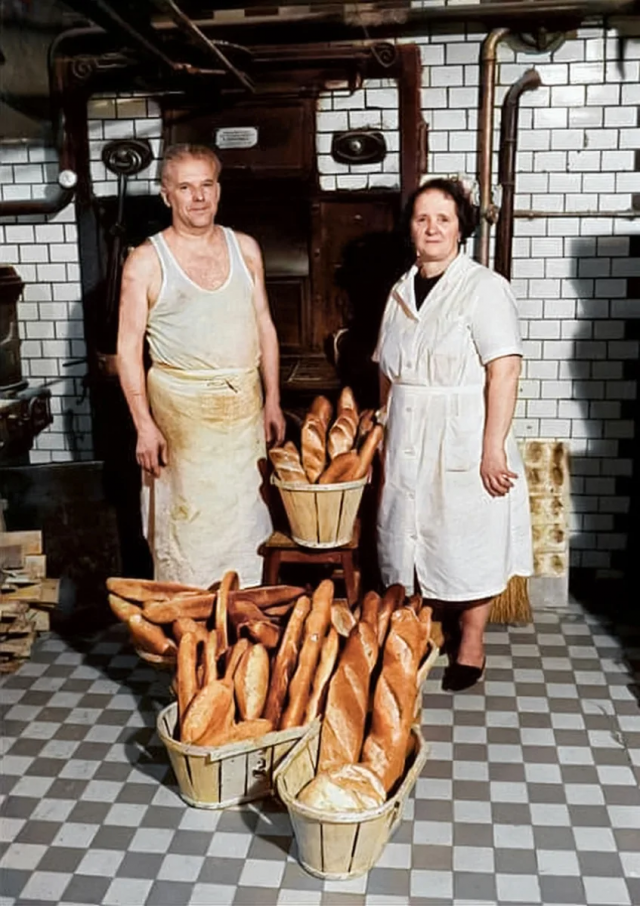 Утренние багеты. Пекари со своей продукцией. Франция, 1968 год.