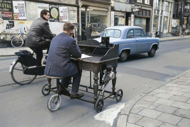 Тест-драйв антикварного стола в качестве мобильного офиса на улицах Амстердама. Нидерланды, 1961 год.