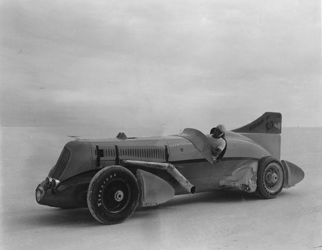 Американский гонщик Эб Дженкинс сидит внутри своего «Мормонского метеора», 1930-е годы. В 1935 году Дженкинс установил на нём мировой рекорд скорости, за 24 часа проехав 3?253 километра со средней скоростью 217 км/ч на соляных равнинах Бонневиля в штате Юта. Фото как раз оттуда.