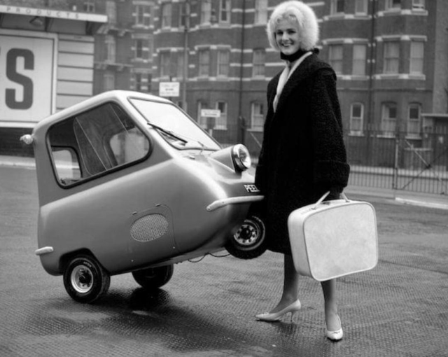 Peel P50 — трёхколёсный микромобиль-мотоколяска, 1960-е. До сих пор держит рекорд как самый маленький серийный автомобиль. Весит всего 59 кг.