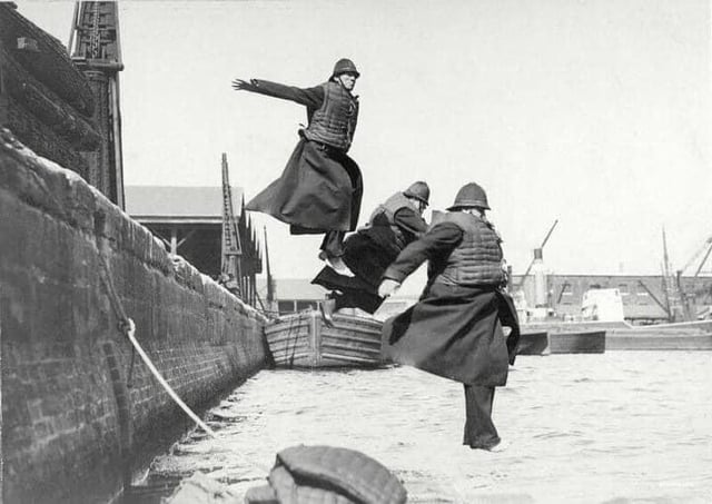 Лондонские полицейские тестируют спасательные жилеты, прыгая в Темзу, 1930-е годы