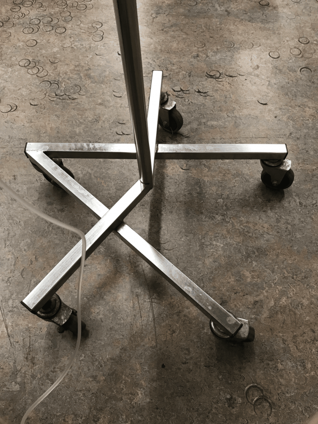 Эта больничная стойка для внутривенных вливаний имеет необычное расположение ножек
