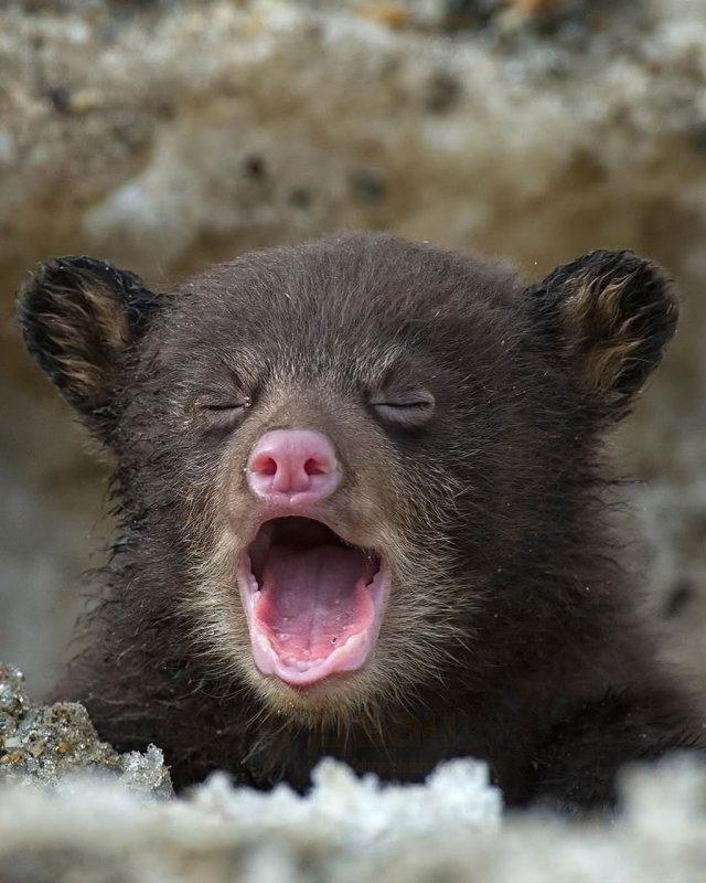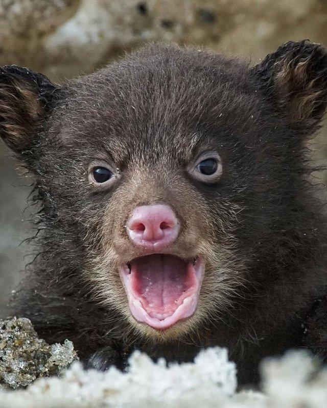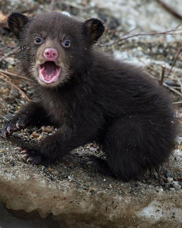 Внимание, медвежонок впервые в жизни выбрался из берлоги! Поглядите с каким удивлением малыш осматривает незнакомый мир вокруг. Пожалуй, многие из нас так частенько выглядят по утрам.