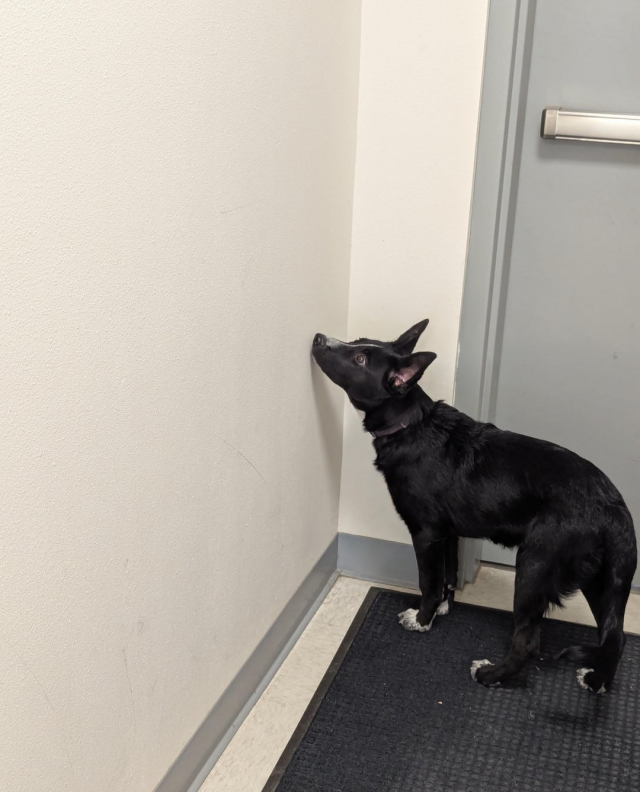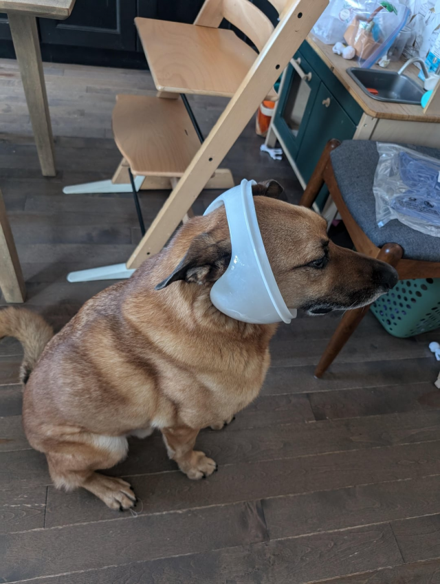 Моя собака залезла в мусор в туалете, теперь у неё есть головной убор