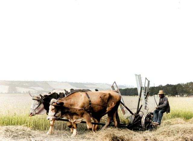 Фермер и его сенокосный аппарат. Германия, 1904 год.