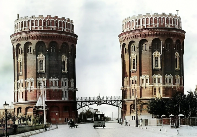 Эти башни были возведены под руководством архитектора Максима Геппенера в 1893 году. Сооружение представляло собой яркий образец краснокирпичной эклектики. Из этих башен воду направляли в водопроводы к центру города.