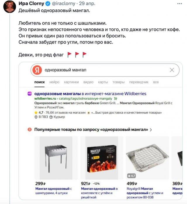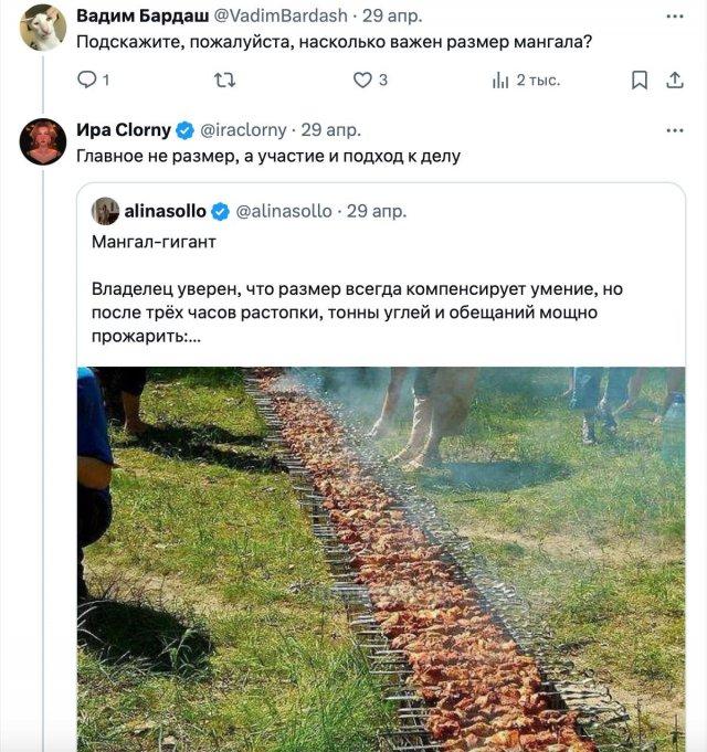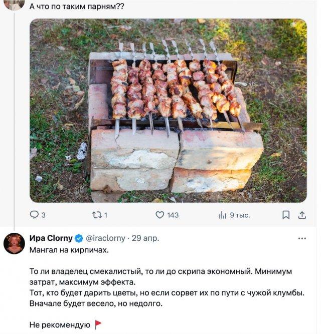 Актуальный тред в «X», где девушка решила обсудить свои наблюдения о связи между мангалом и характером мужчины, который на нем жарит мясо.