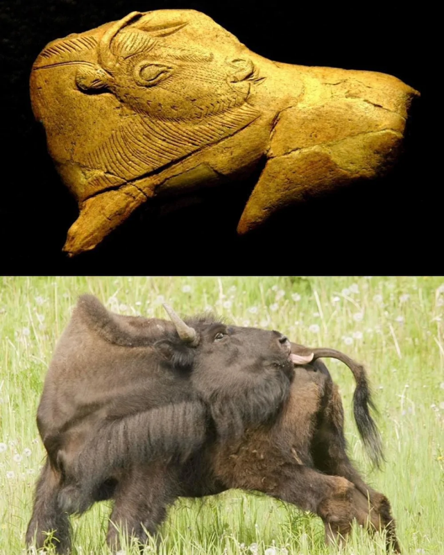 «Бизон, вылизывающий укус насекомого». Изделие из оленьего рога было обнаружено во время раскопок во Франции. Возраст находки — 14 000 лет