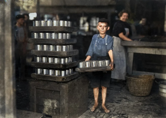 Один из мальчиков, работающих в упаковочной компании JS Farrand, несет тяжелый груз, Балтимор, Мэриленд, 1911 год.