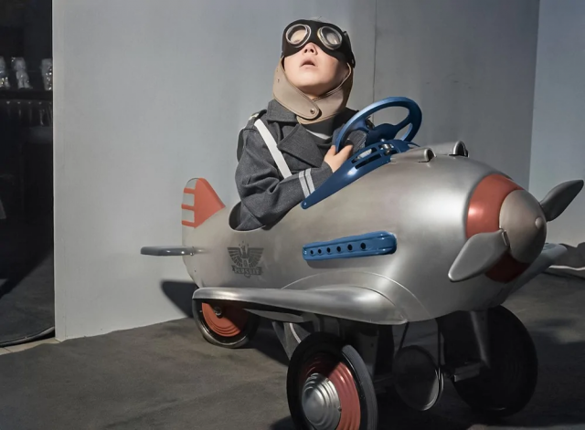Мальчик в костюме летчика сидит в игрушечном самолете. США, 1941 год.