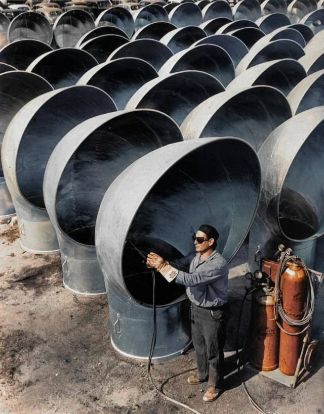 Сварщик обрабатывает трубы для коммерческих судов, Калифорния, 1942 год.