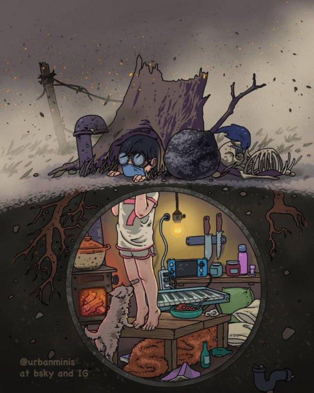 Философские картинки, в которых затрагиваются экологические проблемы, вопросы отношений, любви и будущего.