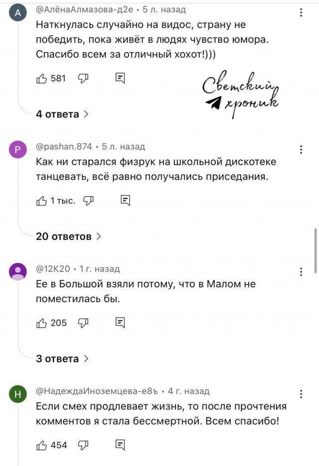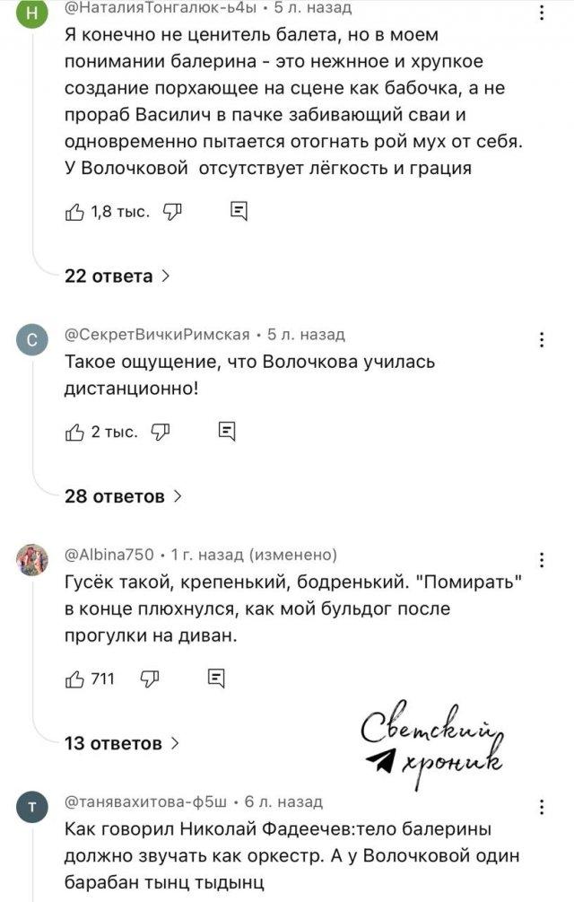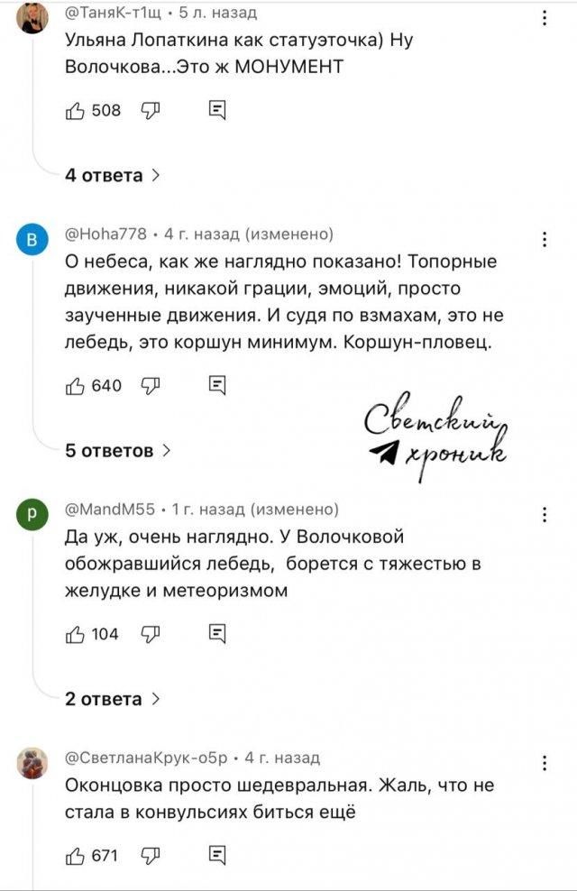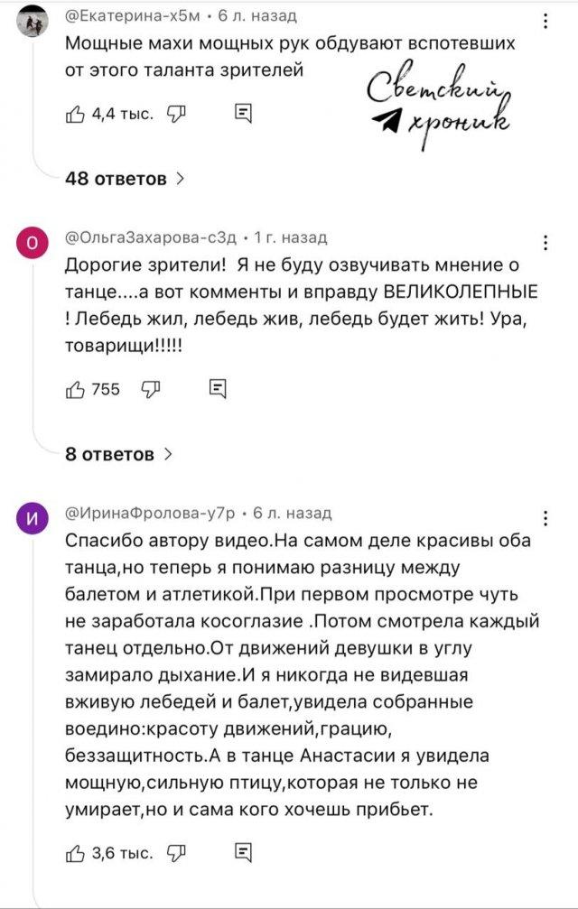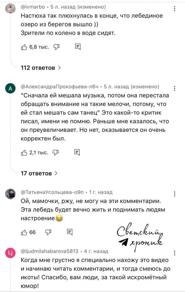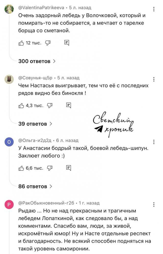 Давайте поговорим о высоком - то есть о балете. Волочкову в купели мы видели, а вот на сцене уже давно нет. Между тем, в Сети сравнили «Умирающего лебедя» Анастасии Волочковой и Ульяны Лопаткиной (это великая русская балерина!). По центру - лебедушка Настя. Важное замечание - видео на скорости 1,5.