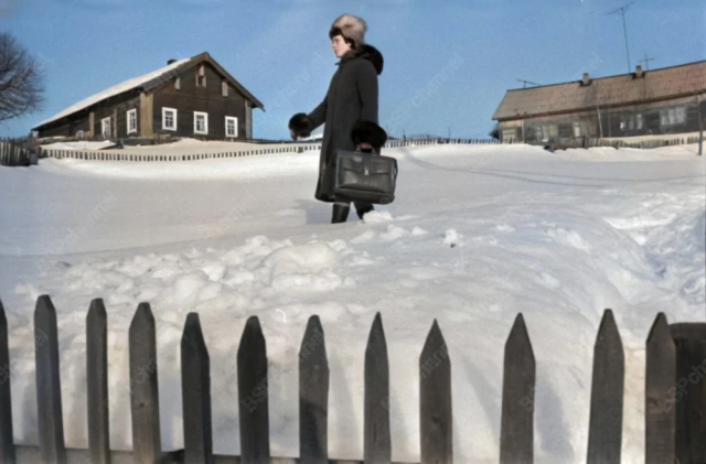 Учительница начальной школы в деревне Водлозеро Пудожского района Галина Егорова. Дорога в школу. Карельская АССР, 1982 год.