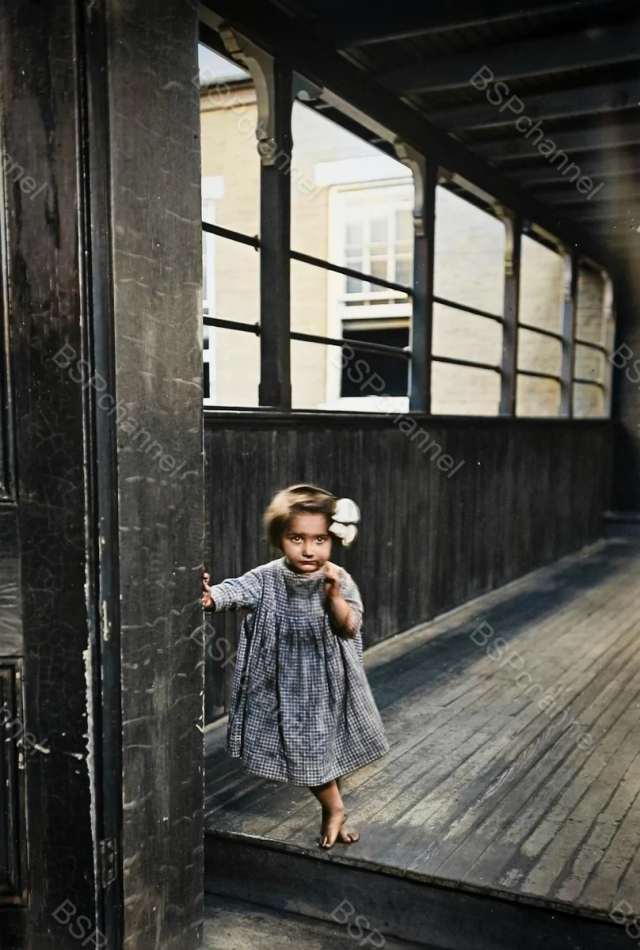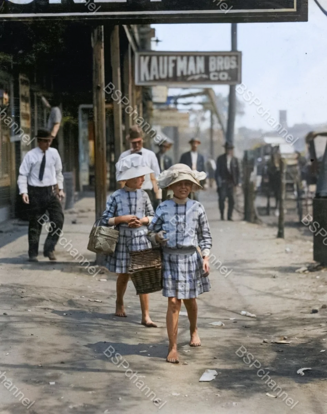 Маленькая босая девочка в грязном клетчатом платье стоит на дорожке между двумя многоквартирными домами. Питтсбург, Пенсильвания, 1909 год.
