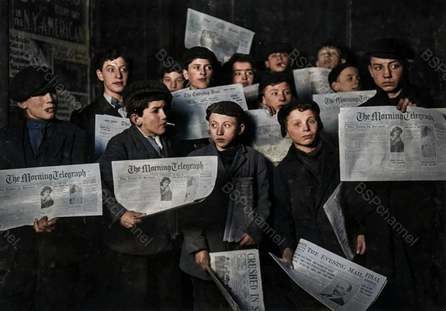 Группа разносчиков с газетами в 2 часа ночи около Бруклинского моста в Нью-Йорке, 1908 год.