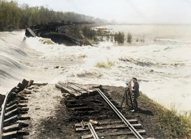 Мужчины, женщины и дети пробираются среди огромных ледяных глыб по замерзшей реке Огайо, Цинциннати, штат Огайо, зима 1917–1918 гг.